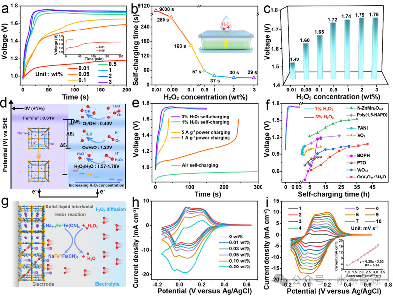 a)不同H2O2浓度下自充电过程的电压-时间曲线。H2O2浓度对(b)自充电时间和(c)OCV的影响。d)H2O2和O2自充电过程的能级跃迁图。e)H2O2自充电、动力充电和空气自充电的电压-时间曲线。f)H2O2自充电电池与其他先前报道的化学自充电系统的自充电时间比较。g)固液界面氧化还原反应及H2O2扩散示意图。(h)NaFeFe(CN)6电极在不同H2O2浓度下在5 mV s-1下的CV曲线和(i)在0.05 wt% H2O2溶液中不同扫描速率下的CV曲线。