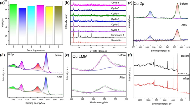 图 4. (a) Recyclability of catalyst 3 for benzonitrile synthesis with formamide and iodobenzene. (b) PXRD of 3 after the catalytic reaction. (c-f) XPS spectra of 3 before and after catalysis.