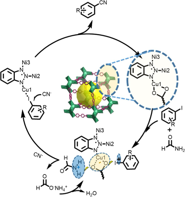 本研究通过自下而上的策略结合中国传统榫卯结构构筑了72核笼状金属-有机框架材料,随后通过金属掺杂实现Cu/Ni协同高效催化芳基腈的合成,这是首例采用甲酰胺作为氰源合成芳基腈的异相催化剂。