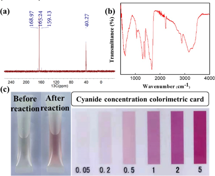 图5. (a) 13C NMR spectrum, (b) IR spectrum, and (c) cyanide concentration colorimetric card testing result of the catalytic reaction filtrate (formamide without iodobenzene catalyzed by catalyst 3).