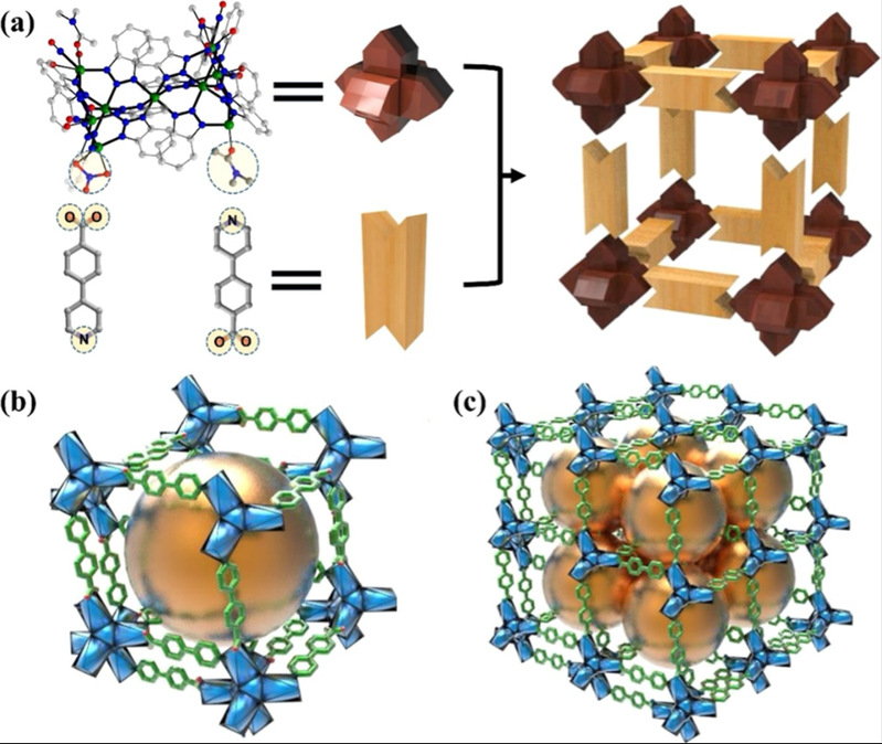 图1. (a) The assembly process of [Ni72] nanocages through the bottom-up synthesis strategy. (b) The structure of [Ni72] nanocages. (c) 3D structure of framework.