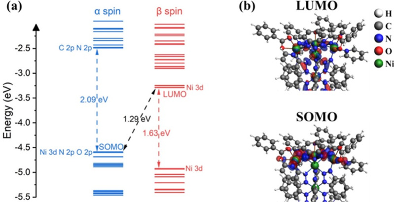 图3. (a) Kohn-Sham energy levels of frontier orbital of the [Ni9] cluster. (b) The LUMO and SOMO of [Ni9] cluster based on the PBE-D3/PAW level of optimization (cutoff = 0.02 au).