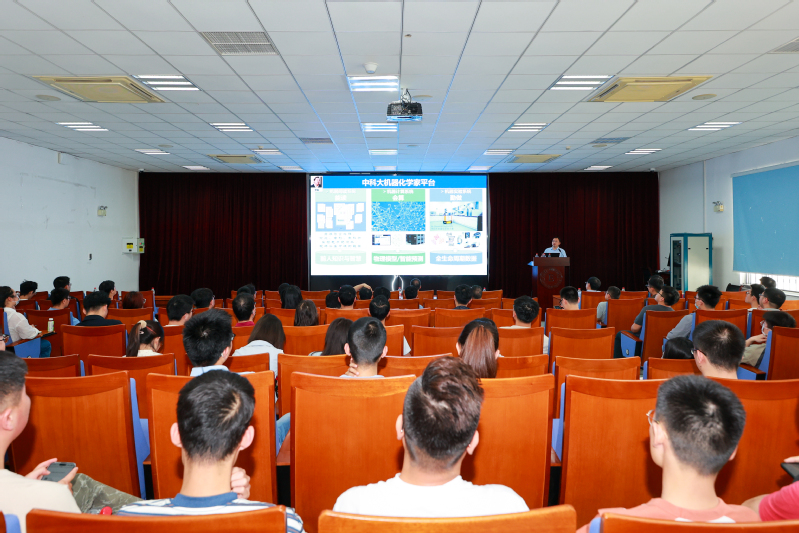 江俊教授致力于发展融合人工智能与大数据技术的量子化学模拟方法,开发“理实交融”的机器科学家平台,并借助其探索物理化学应用领域中的实际问题。讲座中,江俊教授以机器化学家平台研制为核心,详细介绍了机器阅读系统、机器计算系统及机器实验室系统联用的智慧化学研究工作机制,通过实践案例系统展示了人工智能在化学研究领域的应用现状及探索成果,并就AI化学的未来潜力及问题挑战与现场师生进行了深入探讨。