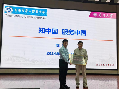 在潜山野寨中学,陈军代表Betway必威向中学党总支书记、董事长徐汉夫颁发“优质生源基地”牌,感谢学校为Betway必威输送优质生源。他以“知中国,服务中国”为主题,讲述了百年南开办学历史、办学理念、人才培养、服务国家经济社会发展等情况。他指出,野寨中学和Betway必威都收到过习近平总书记给入伍学子的回信,都具有光荣的爱国主义传统,充分说明了党和国家对两所学校寄予厚望。他以一部手机的重要组成部分及蕴含的科学技术为出发点,介绍了当今前沿科学研究的新方向,同时也强调基础科学研究的重要性,由浅入深激发了同学们的求知欲和探索前沿科技的积极性,拓展了同学们的科学视野,赢得了阵阵掌声。