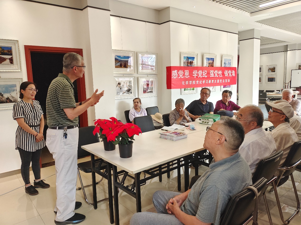 柳凌艳希望退休党员在丰富退休生活、强健体魄的同时,坚持政治理论学习,从坚定捍卫“两个确立”、坚决做到“两个维护”的高度,深刻领悟开展党纪学习教育的重大意义,将学习宣传贯彻《条例》作为当前和今后一个时期的重要政治任务,切实用《条例》武装头脑、指导实践,发扬南开化学新老传承的光荣传统,以师德师风建设“传帮带”,做好青年教师和莘莘学子的“引路人”。