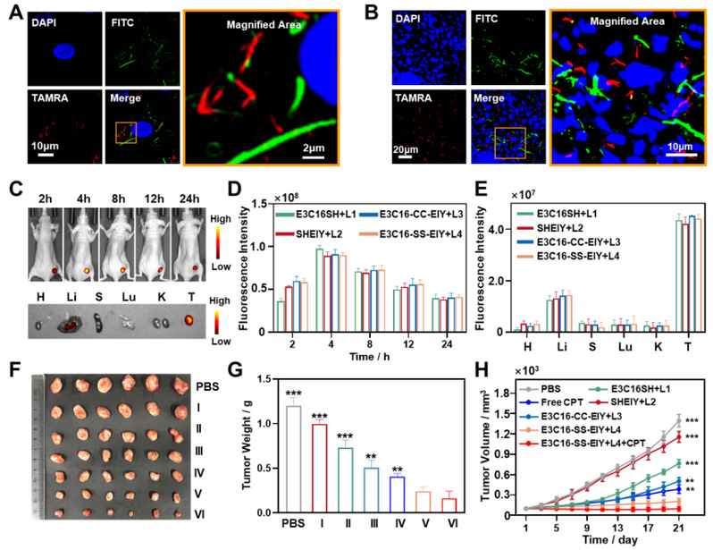 图3. 多肽自分类组装前体E3C16-SS-EIY的肿瘤细胞/活体自分类成像以及体内肿瘤治疗疗效。