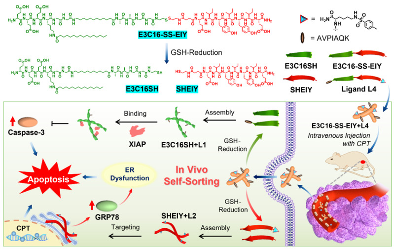 在前期胞内多肽自分类组装(J. Am. Chem. Soc. 2022, 144, 9312-9323.)的工作基础上,余志林团队通过二硫键共价连接两种具有不同组装模式的自分类组装基元E3C16SH和SHEIY,设计合成了具有组装能力的自分类组装前体E3C16-SS-EIY。其中,E3C16SH通过疏水C端穿插组装形成超螺旋纳米带,而SHEIY以哑铃型两亲性结构组装形成扁平纳米带,共价连接通过破坏它们原有的自分类组装结构从而实现在肿瘤组织内GSH切割,同时释放两组自分类组装基元的目的。在此基础上,通过共价连接的方式分别在多肽E3C16-SS-EIY序列N端引入XIAP蛋白靶向基团Smac肽(AVPIAQK)以及C端引入具有内质网靶向性的对甲苯磺酰胺(Ts)构建多肽配体L4。将L4与多肽E3C16-SS-EIY进行非共价共组装得到多肽共组装体E3C16-SS-EIY+L4。E3C16-SS-EIY+L4通过肿瘤原位GSH还原后形成自分类组装体E3C16SH+L1和SHEIY+L2,分别形成左手螺旋和扁平纳米带来结合XIAP蛋白和破坏内质网稳态从而诱导Caspase-3蛋白和GRP78蛋白表达上调导致肿瘤细胞凋亡和ER功能性障碍来达到联合治疗的效果。