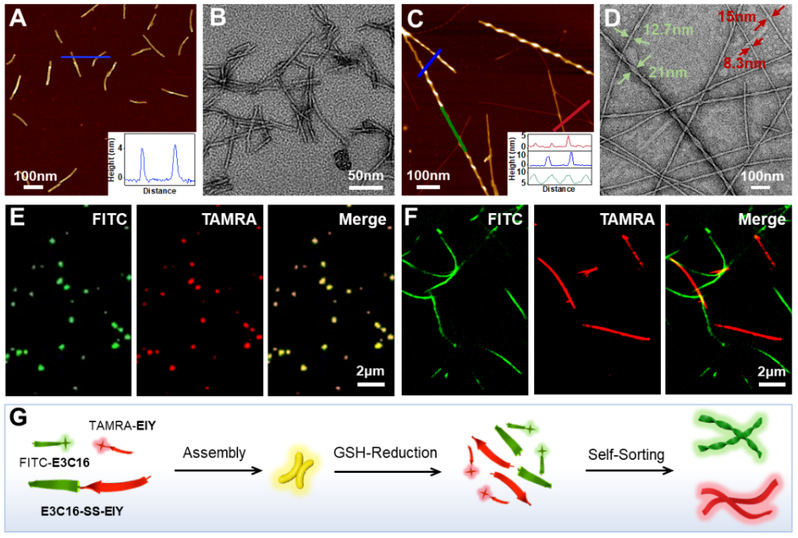 图2. 多肽自分类组装前体E3C16-SS-EIY在GSH响应前后的组装体形貌和自分类组装表征。