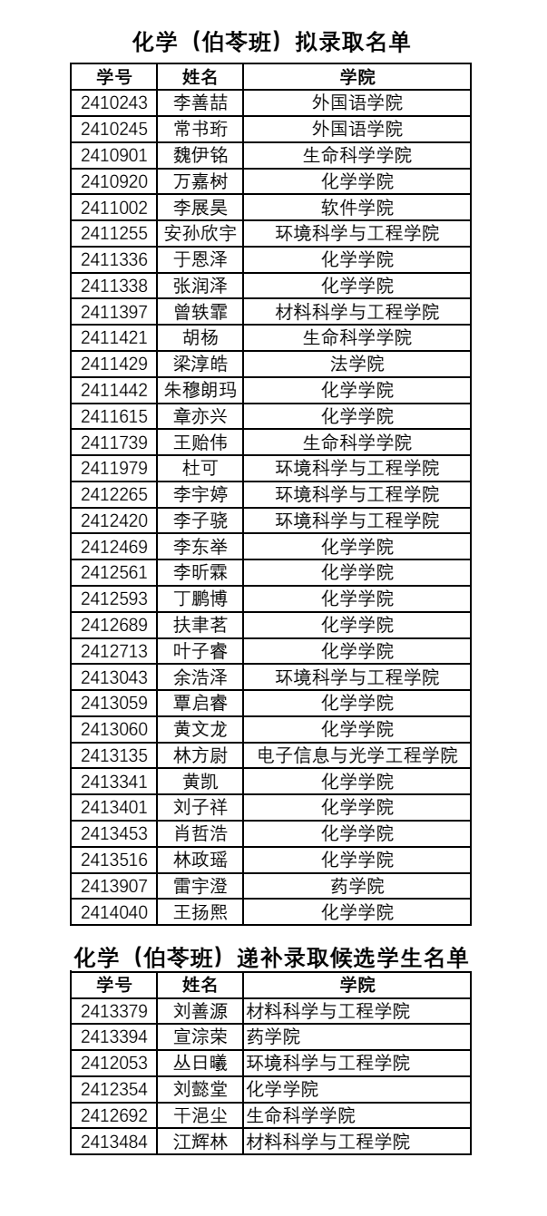 Betway必威2024级化学(伯苓班)专业拟录取名单及递补录取名单公示如下: