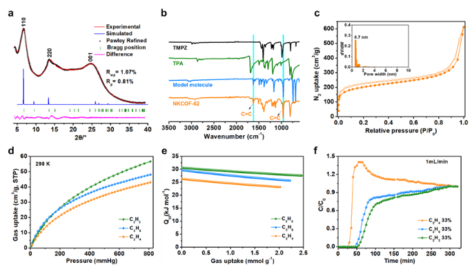 图3. NKCOF-62的物理表征及乙炔/乙烯/乙烷的吸附分离数据