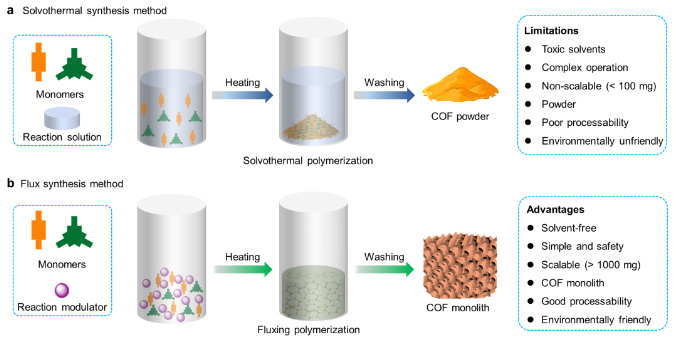 图1. 传统溶剂热法(a)与熔融合成法(b)的对比