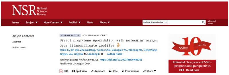近日,《国家科学评论》(National Science Review)刊登了Betway必威最新研究成果“Direct Propylene Epoxidation with Molecular Oxygen over Titanosilicate Zeolites”。Betway必威李玮杰博士与秦斌博士为共同第一作者,李兰冬教授为通讯作者,北京大学马丁教授为共同通讯作者。该团队设计构筑含骨架五配位开放钛位点的*BEA分子筛催化体系(Ti-Beta),应用于丙烯氧气直接环氧化反应中,可同时获得17%的丙烯转化率和85%~90%的环氧丙烷选择性,与当前工业上乙烯直接氧气环氧化反应水平相当,取得重要突破。