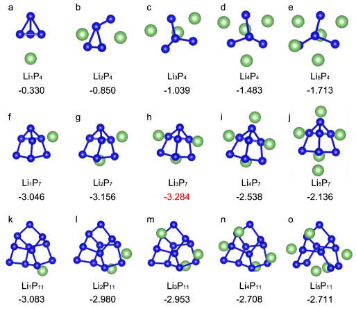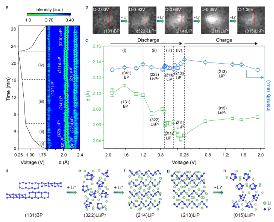 图3包括了BP到Li3P7、LiP以及最终到Li3P的相变,并且指出了在充电过程中只有LiP能够可逆地恢复到Li3P7的晶体结构。