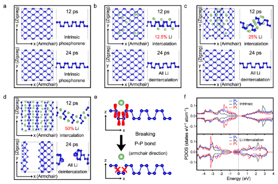 图4 展示了在锂离子含量低于50%时,磷烯的原子级模拟(AIMD)结果。(a−d) 展示了不同Li/P比例下单层磷烯结构的顶视图和侧视图。(e) 展示了锂插层后P−P键的断裂方向。(f) 展示了磷烯在锂插层前后的投影态密度(PDOS)。