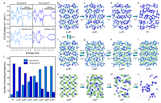 图6 展示了Li3P7、LiP和Li3P的可逆性分析。(a) 展示了P7笼中二键和三键磷原子的投影态密度。(b−i) 展示了不同锂化/脱锂化状态下Li3P7化合物的AIMD模拟结构。(j−n) 展示了LiP化合物在脱锂化过程中的结构变化。