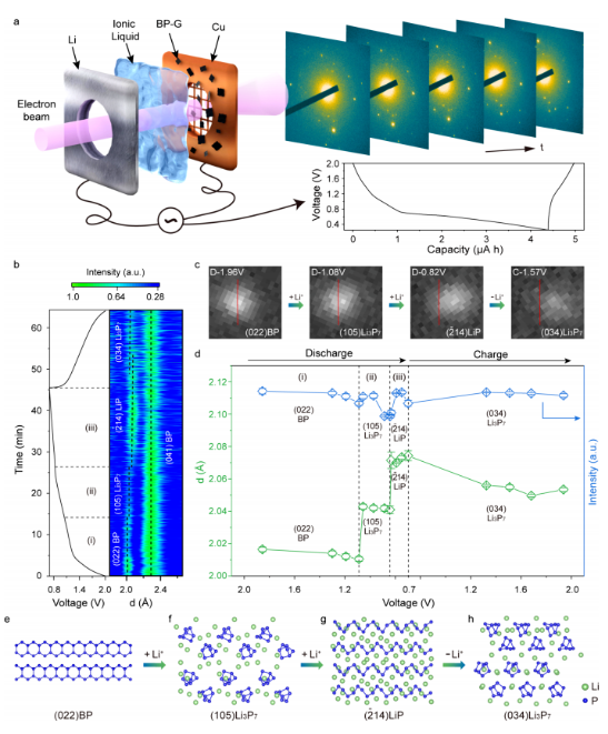 图2 展示了原位选区电子衍射(SAED)测量在0.70−2.0 V电压范围内的相变过程。(a) 展示了用于原位SAED测量的电化学池的设计。(b) 展示了BP-G在该电压范围内的电压曲线和相应的强度图,追踪了BP到Li3P7和LiP的多阶段相变。(c−h) 进一步展示了在不同电压下,BP、Li3P7、LiP和Li3P的衍射峰的演变。
