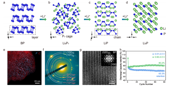 图1 展示了黑磷及其锂化相的结构。(a−d) 部分通过示意图展示了层状BP、含有P7笼的Li3P7、含有螺旋链的LiP和含有孤立P原子的Li3P的结构。这些结构通过不同的表征方法被识别出来。(e−h) 部分则展示了BP-G(黑磷-石墨)样品的形貌、元素分布、选区电子衍射(SAED)模式和高分辨透射电子显微镜(HRTEM)图像,以及BP-G的电化学性能。