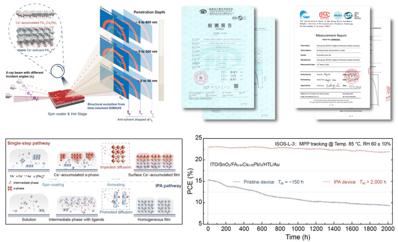 在此基础上,课题组与合作单位开展了深入的理论模拟研究,阐明了该空间组分异质性的根本成因。随后,通过理性筛选配体化学结构,结合多维度原位结晶动力学研究,研究团队首次提出了具有普适性的结晶路径调控转换策略,最终实现了高质量无甲铵FACsPbI3钙钛矿薄膜可控制备,彻底解决了FACsPbI3钙钛矿薄膜的空间组分异质性问题。利用该策略制备的FACsPbI3钙钛矿太阳能电池器件,展现出了世界一流的能量转换效率与高温工况稳定性。经过福建国家光伏产业计量中心和中国科学院上海微系统与信息技术研究所的权威认证,该器件的稳态能量转换效率达到了目前正式钙钛矿太阳能电池的最高水平。