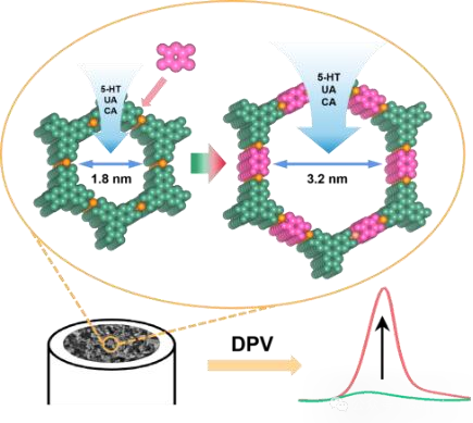 ToC图. 采用新的配体插入策略合成了介孔二维共轭MOF。通过在Cu3(HHTP)2(HHTP=六氢三亚苯)的金属节点上插入线性配体2,5-二羟基苯醌,使MOF的孔径从1.8 nm扩大到3.2 nm。这种MOF的孔径增大有利于氧化还原物质的扩散,从而提高了对各种分析物的电化学检测的灵敏度。