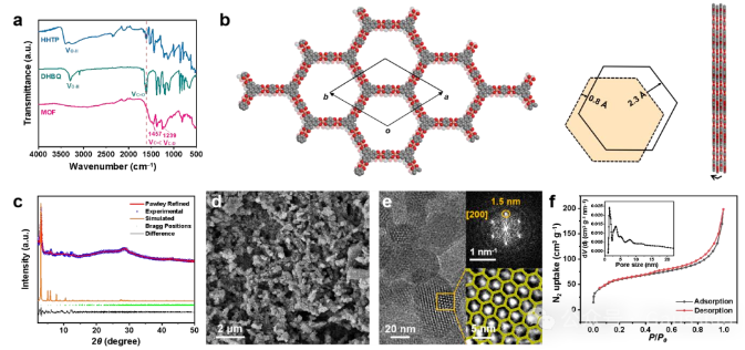 图1. Cu3(HHTP)(DHBQ)1.53-的表征。(a)Cu3(HHTP)(DHBQ)1.53-样品和配体DHBQ和HHTP的FT-IR光谱。(b)AA锯齿状模型的空间填充模型。红色、灰色和橙色球体分别代表O、C和Cu原子。为清楚起见,省略了氢原子。(c)基于优化AA锯齿模型的PXRD Pawley细化。(d)扫描电镜图像。(e)HRTEM图像和SAED图样,Cu3(HHTP)(DHBQ)1.53-的骨架以黄色突出显示,并覆盖在放大的HRTEM图像上。(f)N2吸附等温线。(f)插图:孔径分布图。
