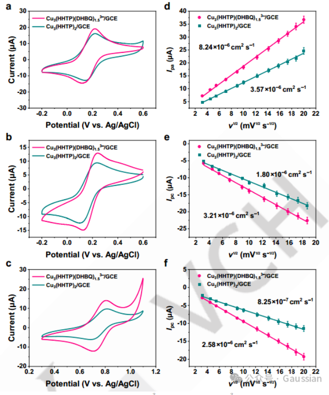 图3. 在含有(a-d)FcMeOH(1 mm)、(b,e)Fe(CN)63−(1 mm)和(c,f)IrCl63−(1 mM)的KCl溶液(0.1 M)中,Cu3(HHTP)(DHBQ)1.53-包覆和Cu3(HHTP)2-包覆GCE的(a-c)CV曲线(扫描速率为100 mV s−1)和(d-f)Randles-Sevcik图。每次测量重复三次,平均值和标准差如图所示。