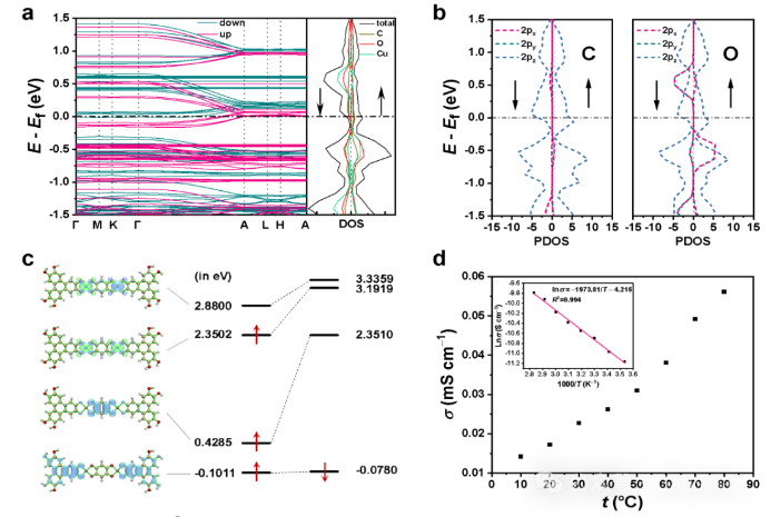 图2. Cu3(HHTP)(DHBQ)1.53-的电子性质。(a)能带结构和DOS曲线。(b)C和O原子轨道的投影态密度(PDOS)。(c)单层前沿轨道的电荷密度。(d)不同温度下的电导率。(e)插图:Arrhenius拟合随温度变化的电导率数据。