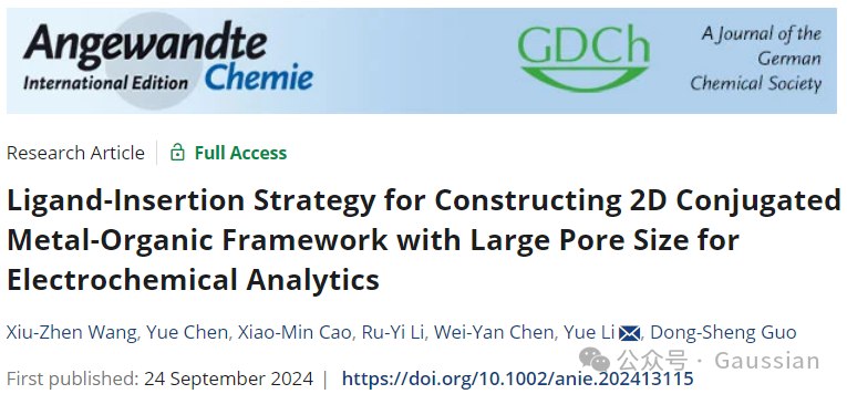2024年9月24日,Betway必威郭东升、李悦团队在Angew. Chem. Int. Ed.期刊发表题为“Ligand-Insertion Strategy for Constructing 2D Conjugated Metal-Organic Framework with Large Pore Size for Electrochemical Analytics”的研究论文,团队成员王秀珍为论文第一作者,李悦为论文通讯作者。