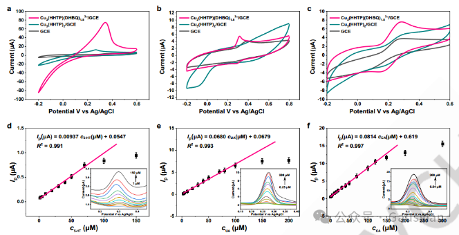 图4. Cu3(HHTP)(DHBQ)1.53-包覆、Cu3(HHTP)2-包覆和裸GCE在含有(a)5-HT(1 mM)、(b)UA(1 mM)和(c)CA(1 mM)的PBS(0.1 M,pH=7.4)中的CV曲线。DPV峰值电流与Cu3(HHTP)(DHBQ)1.53-包覆GCE上DPV 的峰值电流与(d)5-HT、(e)UA和(f)CA的浓度之间的线性关系。脉冲宽度=0.05 s,脉冲幅度= 0.05 V。(d−f)插图:不同浓度分析物记录的DPV曲线。