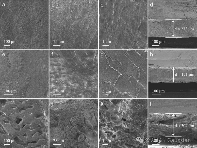 图4. (a–d)ATO-12Na在1 mA cm−2电流密度和1 mAh cm−2容量下钠沉积/剥离循环后的扫描电子显微镜(SEM)图像。(e–h)Na-20在相同条件下的SEM图像。(i–l)裸钠对称电池在相同条件下的SEM图像。