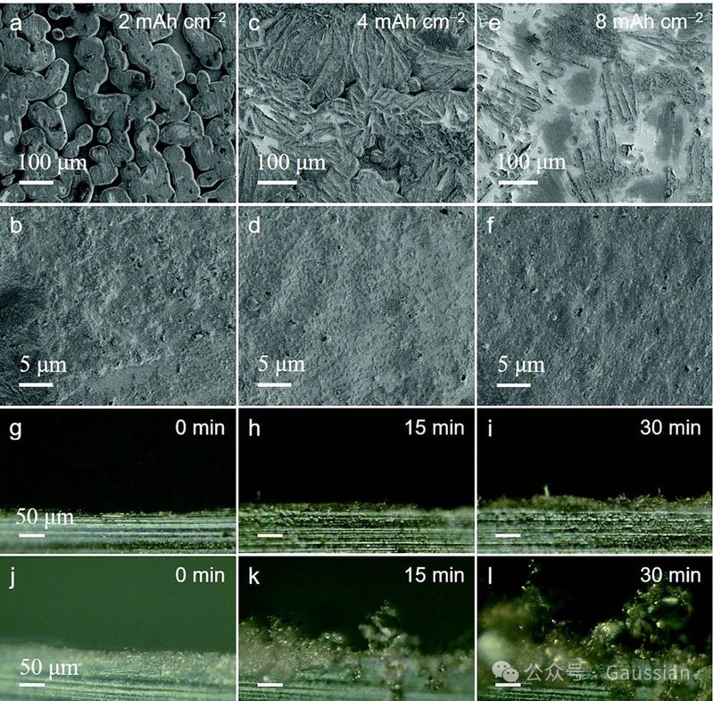 图6. (a,b)在0.5 mA cm−2电流密度和2 mAh cm−2钠沉积容量下,ATO-12Na的扫描电子显微镜(SEM)图像。(c,d)在4 mAh cm−2钠沉积容量下的SEM图像。(e,f)在8 mAh cm−2钠沉积容量下的SEM图像。(g–i)在0.5 mA cm−2电流密度下,原位光学显微镜记录的ATO-12Na电极上钠沉积的图像。(j–l)相同电流密度下,裸钠电极上钠沉积的原位光学显微镜图像。