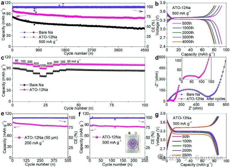 图7. (a)在500 mA g−1电流密度下全电池的循环性能。(b)ATO-12Na复合负极在500 mA g−1电流密度下不同循环时的充放电曲线。(c)不同电流密度下的倍率性能。(d)长循环后的Nyquist阻抗图。(e)厚度为50微米的ATO-12Na负极在200 mA g−1下的循环性能。(f)ATO-12Na负极软包电池在500 mA g−1下的循环性能。(g)在不同循环周期下相应的充放电曲线。