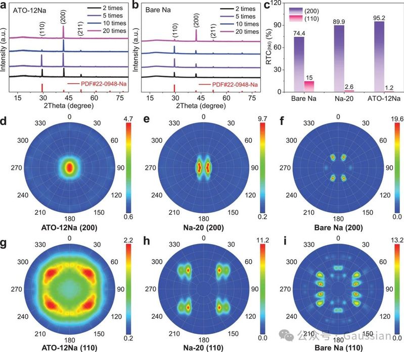 图2. (a)ATO-12Na电极在不同累计叠轧(ARB)循环下的X射线衍射(XRD)图谱。(b)裸钠电极在不同累计叠轧(ARB)循环下的XRD图谱。(c)不同样品的相对织构系数(RTC)。(d–f)ATO-12Na、Na-20和裸钠电极的(200)晶面极图。(g–i)ATO-12Na、Na-20和裸钠电极的(110)晶面极图。