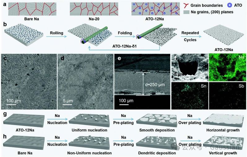 图1. (a)原始钠、Na-20和ATO-12Na箔片的晶粒微观结构。(b)ATO-12Na复合负极制备过程的示意图。(c–e)ATO-12Na的扫描电子显微镜(SEM)图像,(f)SEM聚焦离子束(SEM-FIB)图像及元素分布图。(g)ATO-12Na负极上钠沉积的示意图,(h)裸钠负极上钠沉积的示意图。