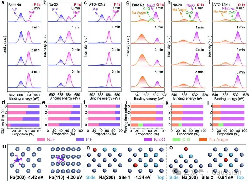 图5. (a–l)裸钠、Na-20和ATO-12Na电极上形成的固态电解质界面(SEI)的XPS归一化深度剖析图。(a–f)F1s光谱及氟元素种类的组分比。(g–l)O1s光谱及氧元素种类的组分比。DFT计算:(m)PF6−与Na (200)面和Na (110)面的结合能。(n,o)Na (200)面不同位置上Na原子的吸附行为。