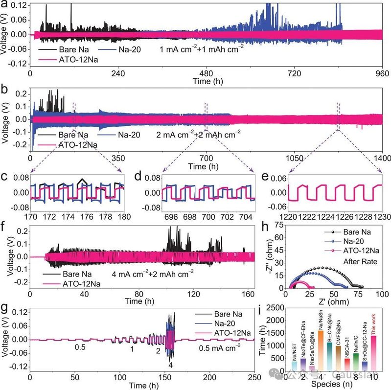 图3. (a)在1 mA cm−2电流密度和1 mAh cm−2容量下,对称电池的电压-时间曲线。(b)在2 mA cm−2电流密度和2 mAh cm−2容量下,对称电池的电压-时间曲线。(f)在4 mA cm−2电流密度和2 mAh cm−2容量下,对称电池的电压-时间曲线。(c–e)在2 mA cm−2下不同时间段的局部放大区域。(g)在4 mAh cm−2容量下,对称电池在不同电流密度下的倍率性能。(h)对称电池在倍率测试后的电化学阻抗谱(EIS)图。(i)ATO-12Na对称电池在2 mA cm−2下的性能对比。