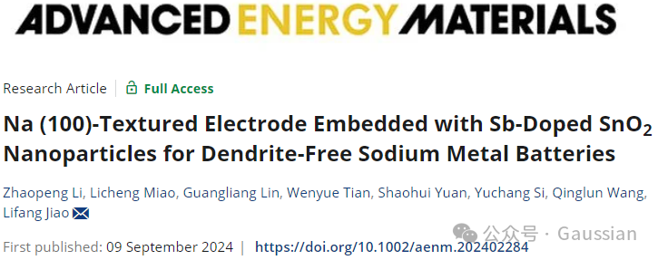 2024年9月9日,Betway必威焦丽芳教授团队在Advanced Energy Materials期刊发表题为“Na (100)-Textured Electrode Embedded with Sb-Doped SnO2 Nanoparticles for Dendrite-Free Sodium Metal Batteries”的研究论文,团队成员李兆鹏为论文第一作者,焦丽芳教授为论文通讯作者。