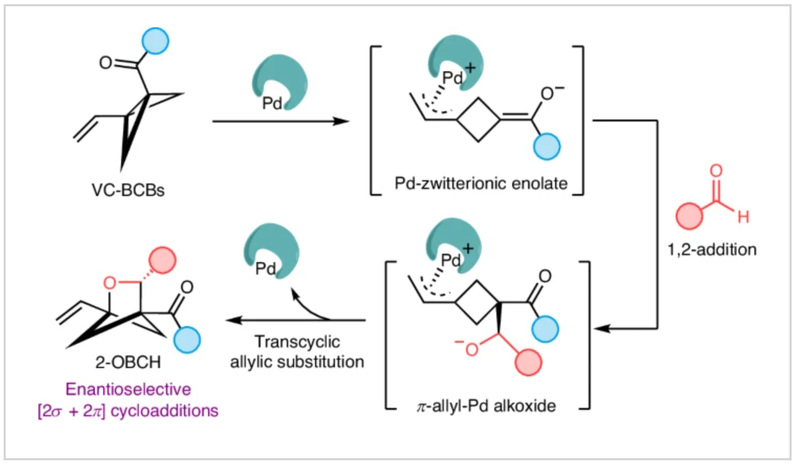 尽管BCB环加成反应在生成三维结构上取得了进展,但在催化对映选择性方面,特别是生成富含对映体的生物电子等排体,尚未充分开发。为了解决这一问题,近日, 提出了一种钯催化的乙烯基羰基-BCB与多种羰基化合物(如甲醛、活性酮、脂肪族和芳香族醛)的 [3+2] 环加成反应。该反应可以快速合成具有 C(sp3) 丰富结构的 2-氧杂双环[2.1.1]己烷。