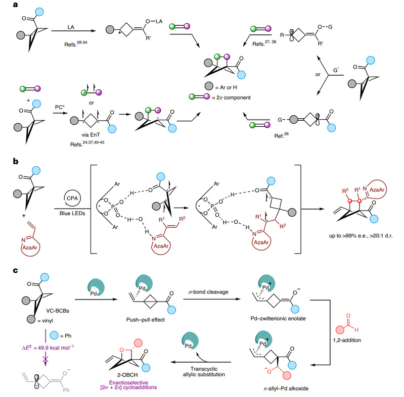 现代药物化学研究表明,增加小分子中 C(sp3) 杂化碳原子的比例和立体中心的数量可以有效提升化合物的药代动力学性质以及药物开发的成功率。因此,开发新的方法来引入富含 C(sp3) 的三维结构成为合成复杂药物分子的重要方向之一。在这一背景下,利用双环[1.1.0]丁烷(BCB)作为反应中的2π组分进行环加成,已成为生成富含 C(sp3) 的生物电子等排体的一种有效策略。