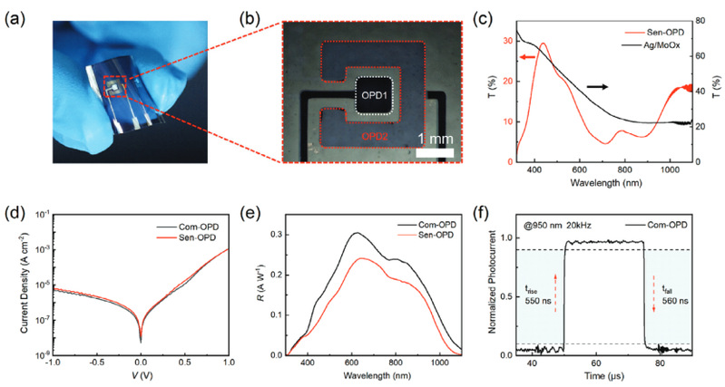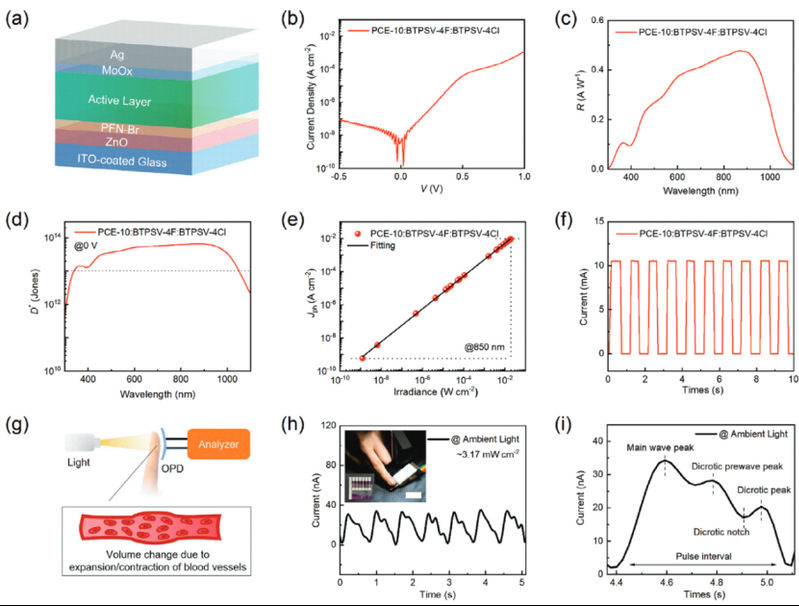 h )使用三元NIR OPD在环境光照射下测量脉冲信号,OPD的有效尺寸为2.0 × 2.0 mm2,标尺为1 cm。