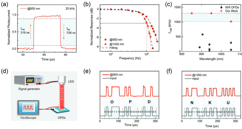 图3 . a )三元NIR OPD在调制频率为20 kHz的950 nm光照射下的光响应和恢复时间。