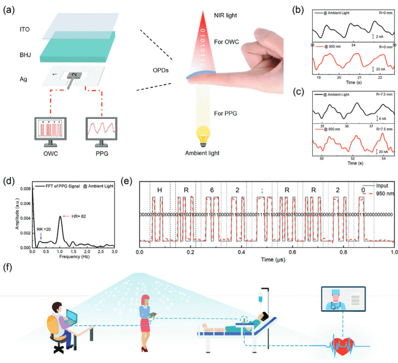 e )在950 nm光下通过无线光通信输出HR和RR结果信号;