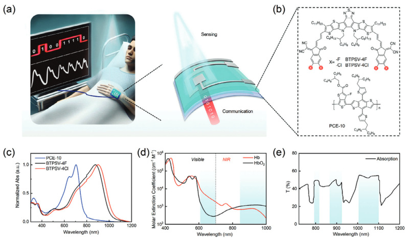 可见光(vis)近红外(NIR)光谱范围从400到800太赫兹(THz),为超高速光无线通信(OWC)提供了巨大的带宽,速度高达100 Gbps。此外,由于其优越的穿透能力,NIR光已被广泛用于无创生命体征监测、成像和远程监控。通过利用这些特性,通过光实现传感和通信功能的光学集成传感与通信(O-ISAC),可以有效解决当前无线网络的频谱和数据传输速度瓶颈,同时提供超越传统无线网络的增强传感功能。此外,柔性O-ISAC可以无缝贴合皮肤以接收全方位光,从而实现连续健康监测和高速信息传输。但是,作为O-ISAC核心组件的传统无机光电探测器(PD)通常受到机械刚性、小面积、弱吸收效率和固定带隙的限制,这阻碍了它们在柔性O-ISAC中的应用。