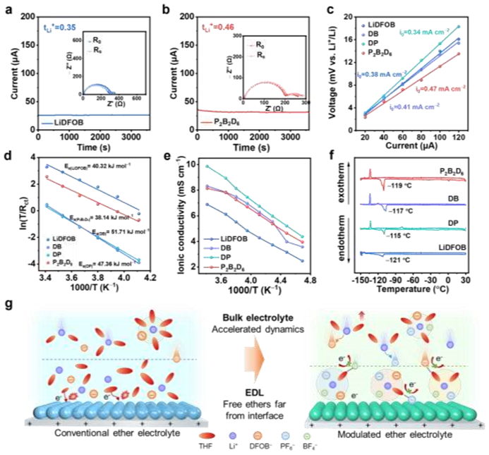 图2:电荷转移动力学和低温电化学性能。(a) LiDFOB和(b) P2B2D6电解液中Li||Li对称电池的Nyquist图和电流-时间曲线,以及(c) LiDFOB、DB、DP和P2B2D6电解液中Li沉积/剥离的交换电流(i0)。(d) 通过Arrhenius方程拟合的Rct的活化能,在20至-30℃的温度范围内。(e) 在20至-60℃温度范围内的离子电导率。(f) 从-150至30℃的DSC曲线图。(g) 传统和离子偶极相互作用调节的醚电解液中双电层的示意图。
