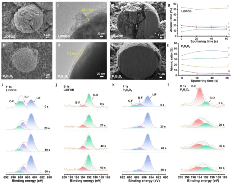 图4:循环后NCM811粒子和CEI层的表征。(a, b) 分别在LiDFOB和P2B2D6电解液中循环50次后的NCM811粒子的SEM图像,以及(c, d) CEI层的相应HRTEM图像。(e, f) 不同电解液中循环后的NCM811粒子的横截面图像。(g, h) 不同电解液中循环后的NCM811上测试元素的原子含量。(i-l) 在LiDFOB或P2B2D6电解液中循环的NCM811正极上,不同Ar+溅射时间下F 1s和B 1s的XPS图谱。