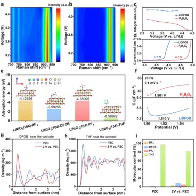 图3:电解液/正极界面的溶剂化环境。在充电过程中工作电极表面层的原位拉曼图谱:(a) P2B2D6和(b) LiDFOB电解液。(c) P2B2D6和LiDFOB电解液中THF在双电层中的不同电压下的变化趋势。(d) P2B2D6和LiDFOB电解液的电化学窗口。(e) 吸附在LiNiO2(104)上的BF4⁻、PF6⁻、DFOB⁻和THF的计算吸附能。(f) P2B2D6和LiDFOB电解液中的零电荷电位。(g, h) MD模拟在不同电位下DFOB⁻和THF靠近正极表面的数密度。(i) 不同电解液成分在正极表面分子含量。