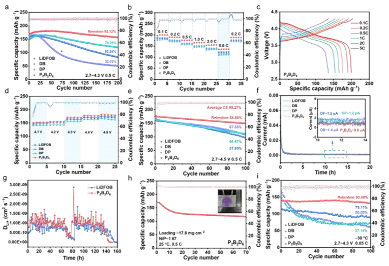 总之,研究人员提出了一种通过多种阴离子调节来改善无氟醚类电解液在高电压下的兼容性的策略。通过结合原位分析和计算,研究人员揭示了溶剂化结构和界面吸附行为及其与CEI层的关系。THF电解液的氧化稳定性通过离子偶极相互作用得到显著提高,这调节了溶剂化成分的相对HOMO能级并重新排列了电解液组分的分解顺序。在界面处阴离子的优先吸附取代了醚分子,导致在正极表面形成了一个溶剂匮乏的界面溶剂化环境,并形成了富含无机物的抗氧化CEI层。由于协同效应,设计的P2B2D6电解液能够维持高电压Li||NCM811电池的稳定运行,在200个循环后实现了93.10%的容量保持,并在4.5V的高电压和-30℃的条件下具有143.3mAh g⁻¹的相当特定的容量。这项工作阐明了离子偶极相互作用在定制溶剂化环境以稳定基于醚的电解液中的作用,并为高能量和低温锂电池的电解液设计策略提供了扩展。