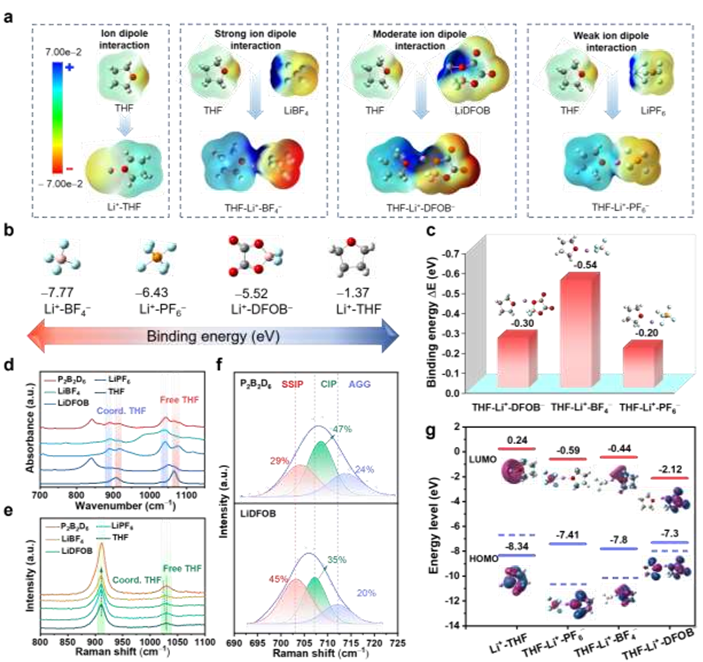 图1:不同电解液的配位环境分析。(a) Li+-THF/THF-Li+-阴离子复合物的静电势计算。(b) Li+-THF和Li+-阴离子复合物的结合能。(c) 不同溶剂化结构中结合能的变化。(d) 不同电解液的FTIR图谱和(e) 拉曼图谱。(f) LiDFOB和P2B2D6在720-725 cm⁻¹范围内的拉曼图谱。(g) THF/Li盐(虚线)和Li+-THF/THF-Li+-阴离子复合物(实线)的前线分子轨道能级及其相应的模拟快照。