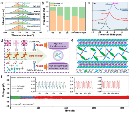 图4. 不同状态下PC溶剂和溶剂化PC(1-3 M电解液, PVFH/M和PVFH@M复合凝胶电解质)对应的(a)红外光谱图及(b)二者的百分比。(c)常规电解液, PVFH/M和PVFH@M对应的核磁钠谱。(d)PVFH@M中各组分的作用机制。(e)PVFH@M中溶剂化结构示意图。(f)常规电解液,PVFH/M和PVFH@M对应的Na//Na对称电池循环性能对比。