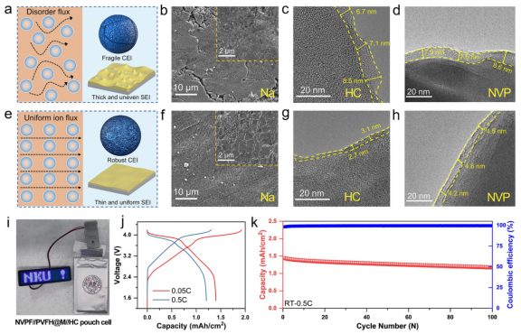 图6. (a) PVFH/M和(e)PVFH@M对应界面层的形成机制示意图。(b)PVFH/M和(f)PVFH@M对应对称电池钠金属负极表面形貌对比。(c)PVFH/M和(g)PVFH@M对应NVP//HC全电池循环后HC负极SEI层厚度对比。(d)PVFH/M和(h)PVFH@M对应 NVP//HC全电池循环后NVP正极CEI层厚度对比。(i)NVP//PVFH@M//HC软包电池点亮LED灯照片。该软包电池对应的(j)充放电曲线及(k)循环稳定性测试。