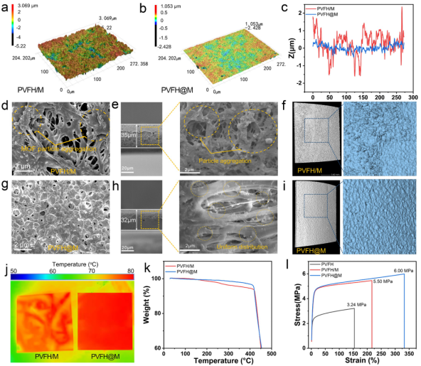 图2.(a-c)PVFH/M与PVFH@M两种复合膜的激光共聚焦显微镜照片及表面粗糙度对比。(d-e,g-h)PVFH/M与PVFH@M两种复合膜的SEM平面及截面对比。(f,i)PVFH/M与PVFH@M两种复合膜的微米CT照片对比。(j)PVFH/M与PVFH@M两种复合膜的红外热成像照片对比。(k)PVFH/M与PVFH@M两种复合膜的热重曲线对比。(l)PVFH、PVFH/M和PVFH@M三种聚合物膜的应力-应变曲线对比。